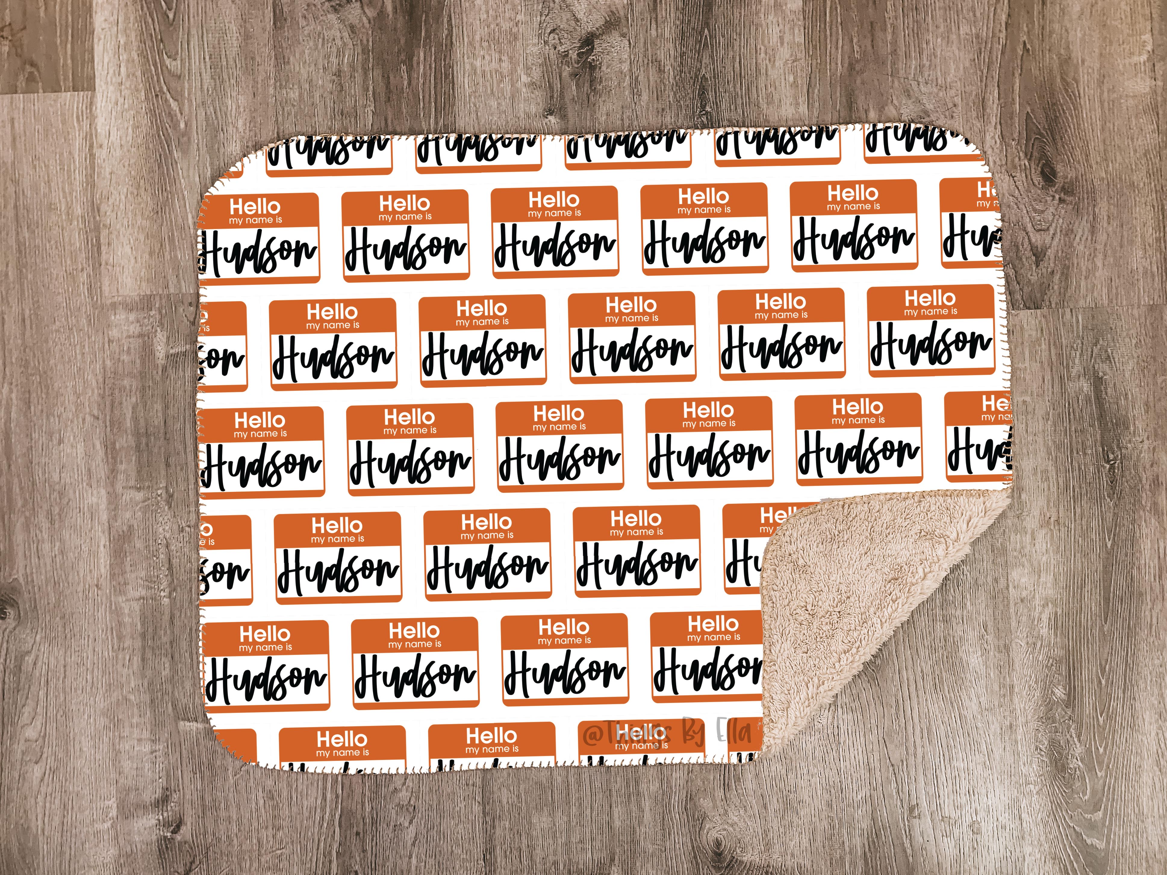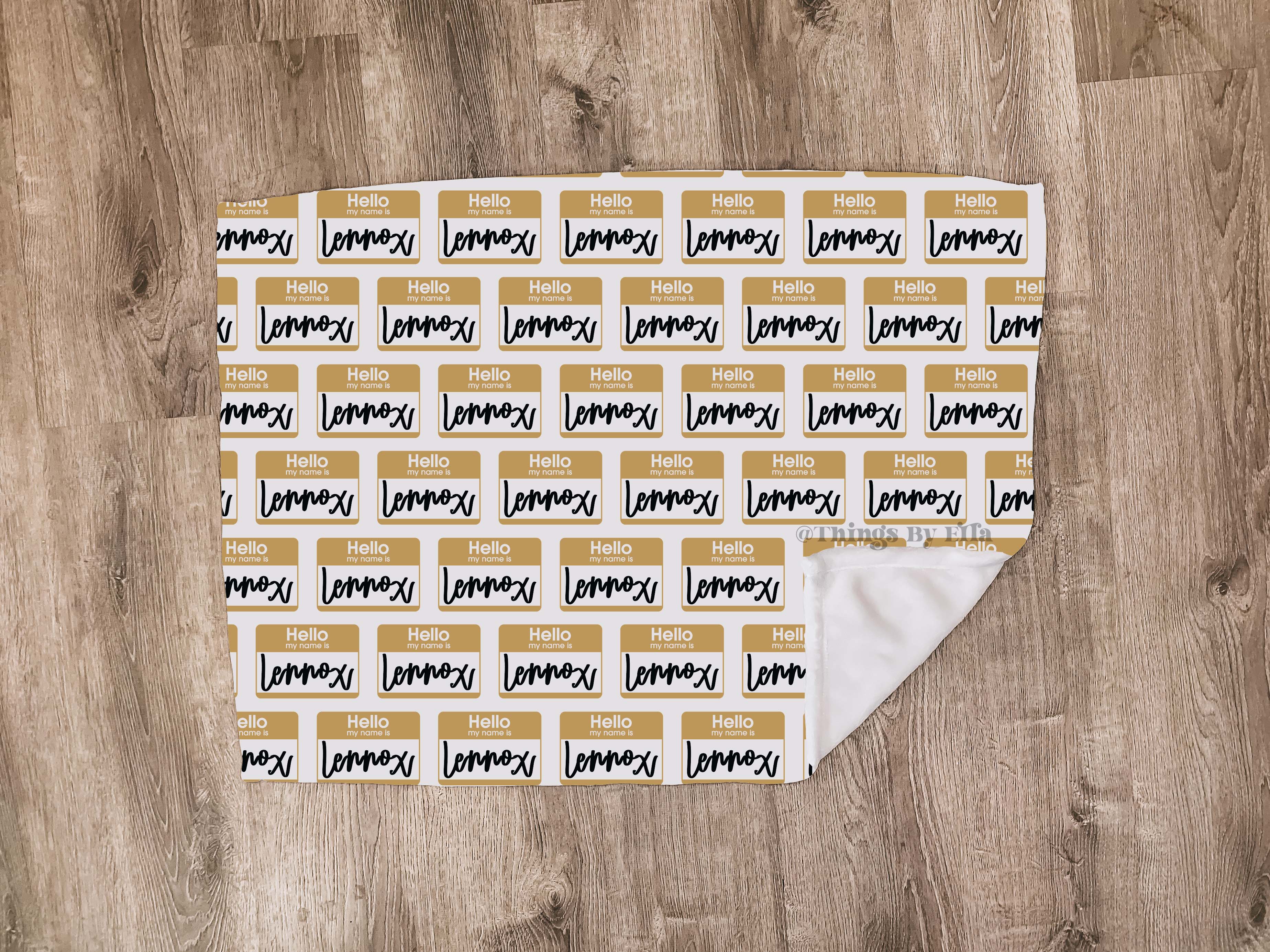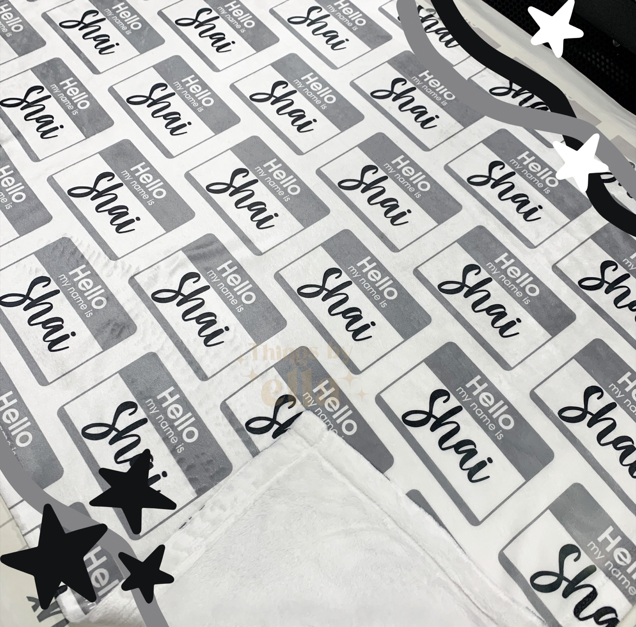 This "Hello my name is" design is customizable with your name of choice and is printed on an ultra smooth micro-minky. The back is lined in a plush neutral colored sherpa and whip stitch finished. This blanket measures 30x40.