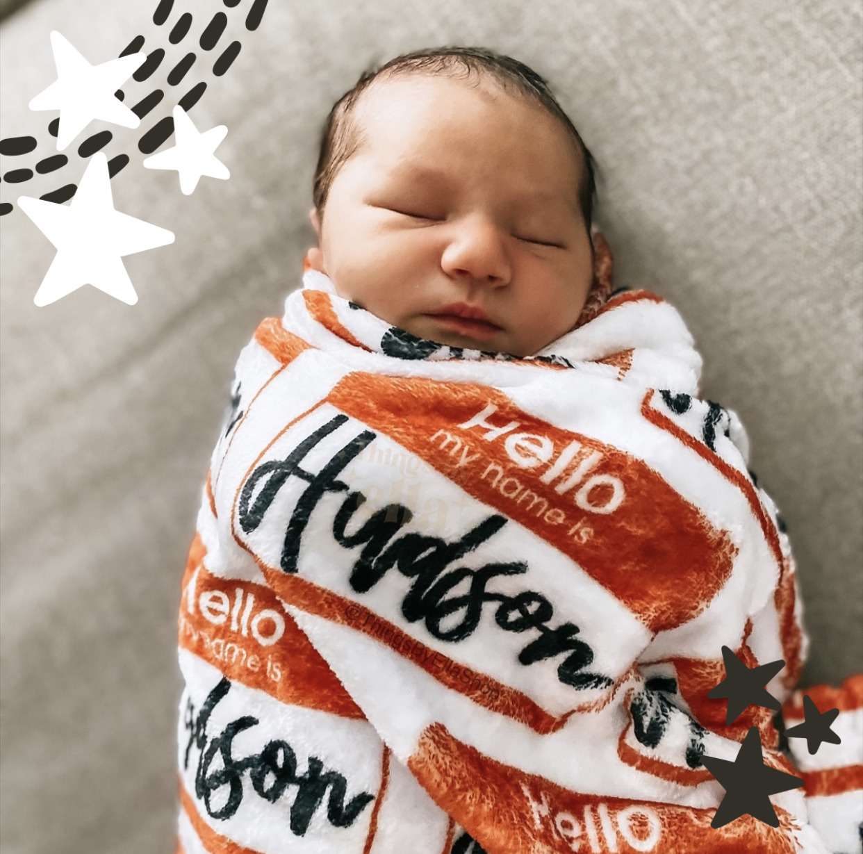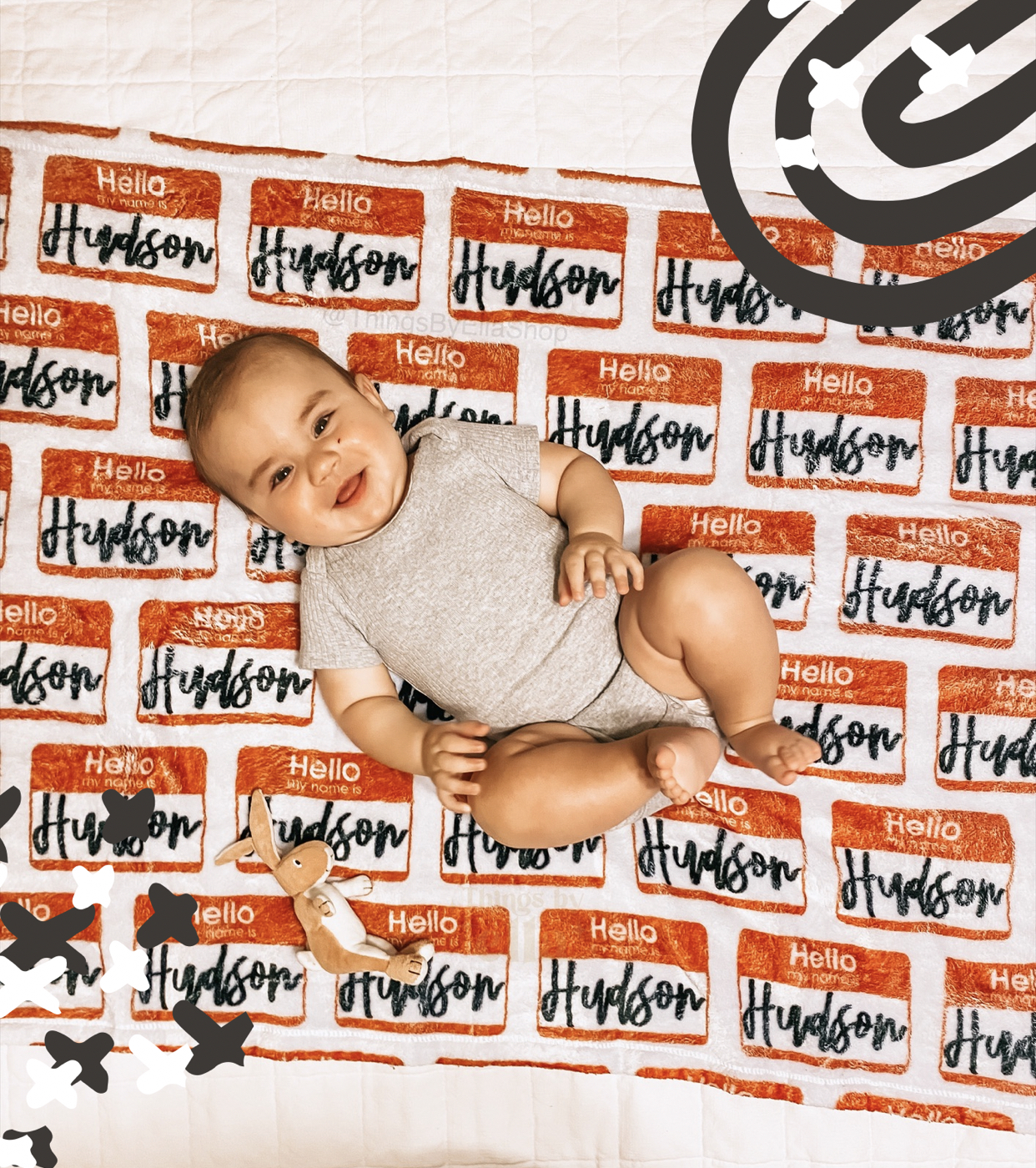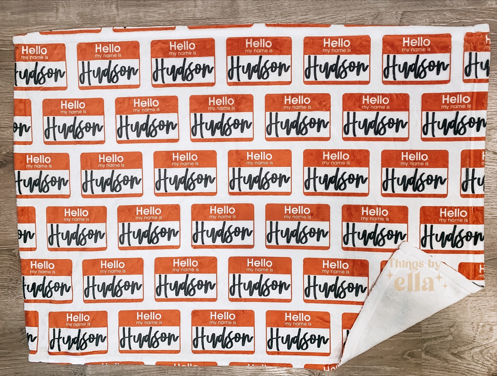 This "Hello my name is" design is customizable with your name of choice and is printed on an ultra smooth micro-minky. The back is lined in a plush neutral colored sherpa and whip stitch finished. This blanket measures 30x40.