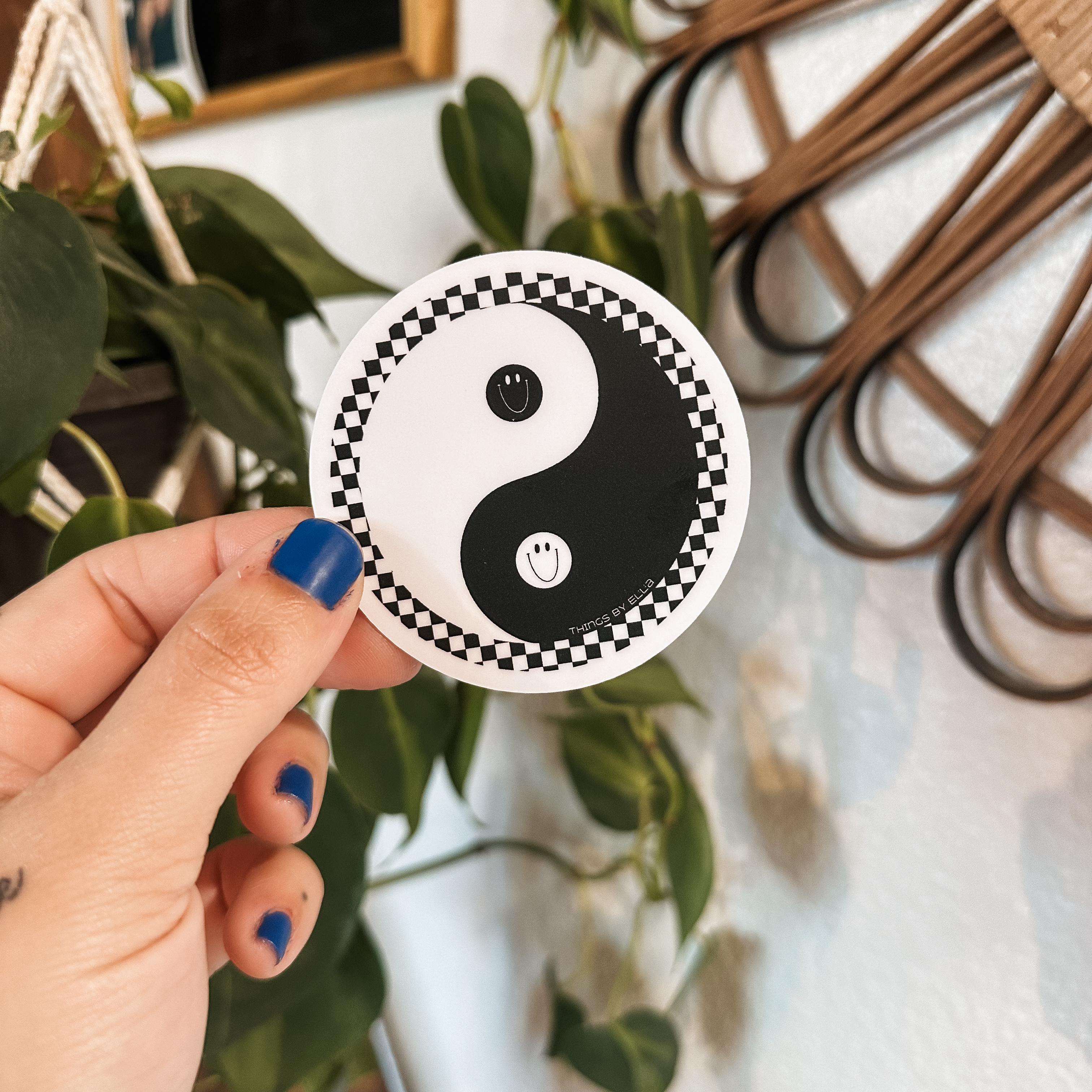 Black and white checkered yin yang sticker; measuring approx. 2.5 inches, weather & water resistant!
